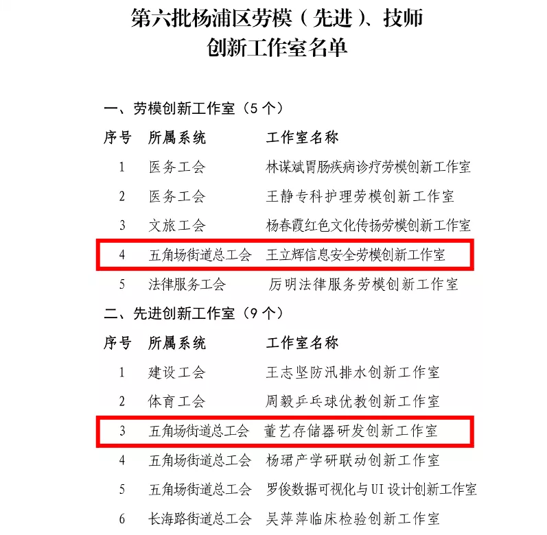 近日,楊浦區(qū)總工會發(fā)布《關于命名第六批楊浦區(qū)勞模(先進)、技師創(chuàng)新工作室的決定》。復旦微電子集團“王立輝信息安全勞模創(chuàng)新工作室”被命名為“楊浦區(qū)勞模創(chuàng)新工作室”,“董藝存儲器研發(fā)先進創(chuàng)新工作室”被命名為“楊浦區(qū)先進創(chuàng)新工作室”。